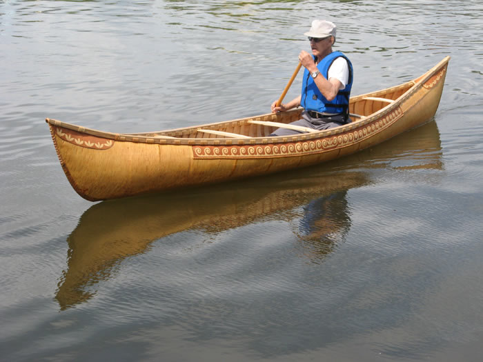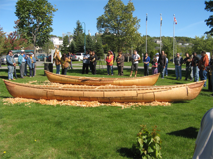 Madawaska Maliseet First Nation near Edmundston, New Brunswick. Together with David Moses Bridges and Eric Otter Bacon, Passamaquoddy birchbark artists, I assisted a group of community members there in the building of an 18-foot canoe. It was built in the shop of Noel Francis, and launched on the Madawaska River. Wayne Brooks came up from St. Mary's to lead the launching ceremony, and he and his son Cody brought the 21-foot Grandmother Canoe along for the occasion. Then in 2012, I was invited back to Madawaska to help build another canoe in Noel's shop, this time a 14-footer, and members of the group participated in gathering the bark for it as well. In 2015, I was again asked back to lead the building of a 22-foot canoe with a group of mostly college-age First Nation members.